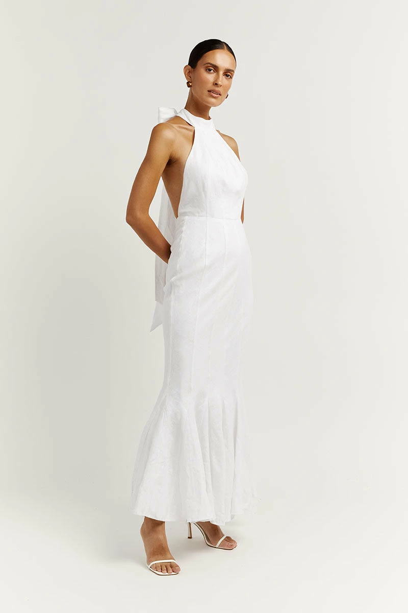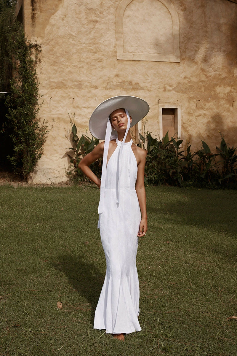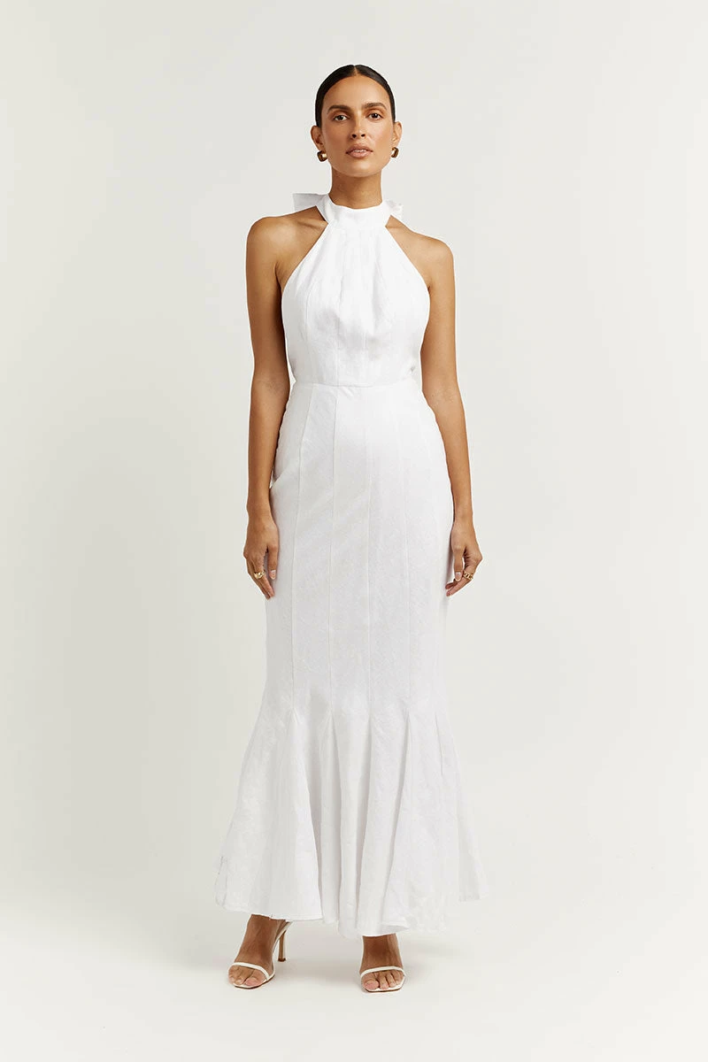DISSH AISLE WHITE LINEN HIGH NECK DRESS