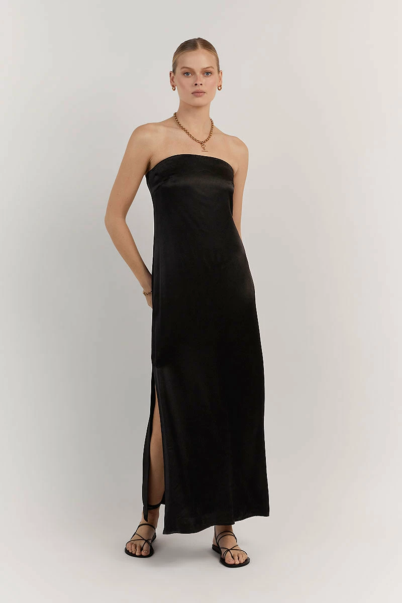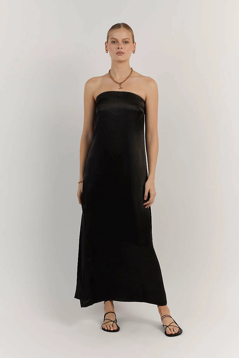 DISSH MIA BLACK STRAPLESS SATIN MIDI DRESS